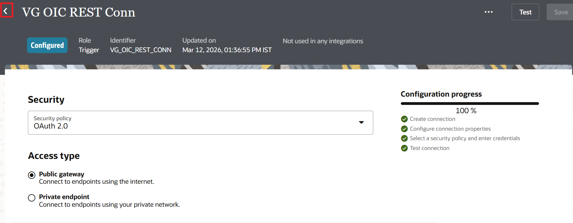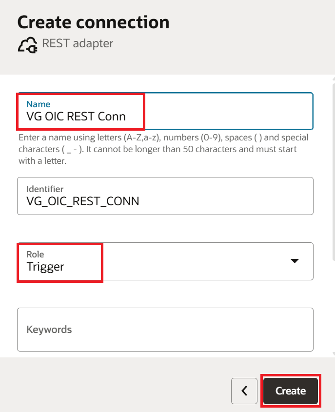 Enter the Name as "VG OIC REST Conn" (VG is my name prefix. You can use your own prefix) and select the Role as "Trigger". The Identifier is auto generated. Click Create. We select the role as Trigger only for a REST connection when we want to expose the integration as a REST service. If we needed to invoke an external REST API, we would select the Invoke role instead.