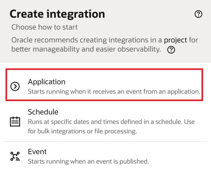 Click on "Application". We select Application because we want our integration to start when an external application sends a request. The Schedule option is for batch or time based processing. The Event option is for integrations triggered by a published business event: