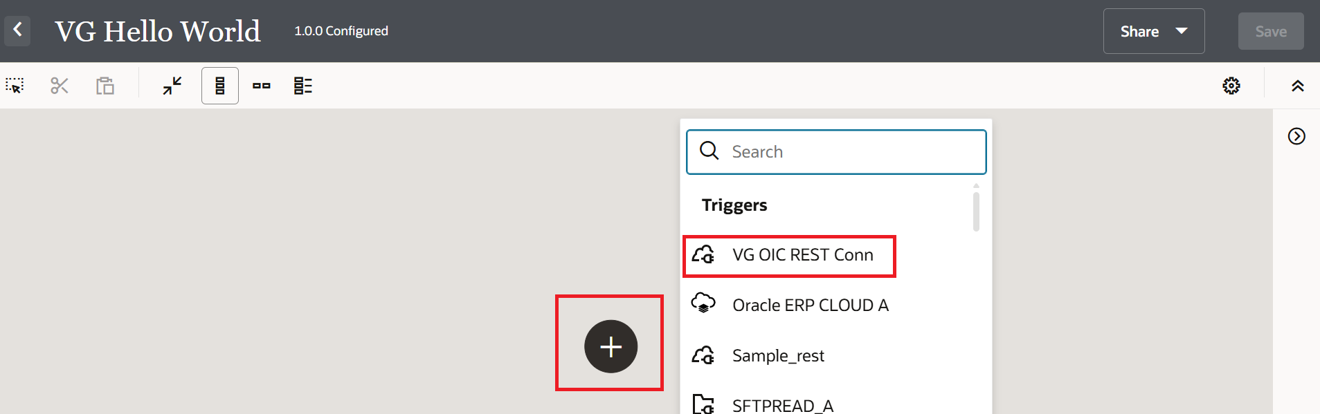 On the integration canvas, click the + icon to add a trigger. Select "VG OIC REST Conn" from the list of available Trigger connections.