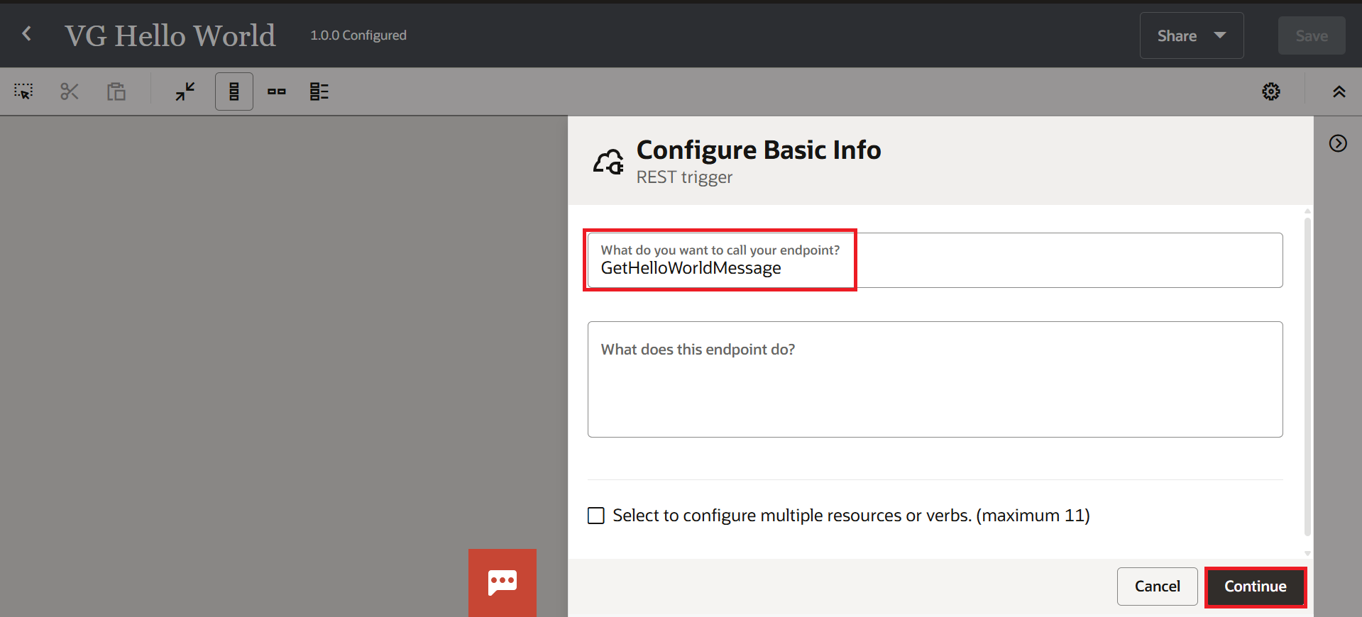 On the Configure Basic Info page, enter the endpoint name as "GetHelloWorldMessage" and click Continue.