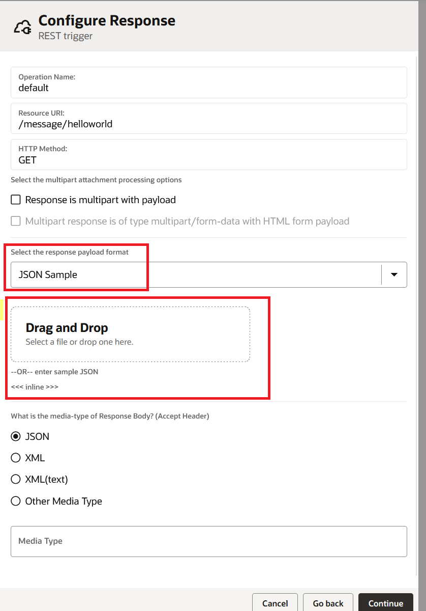 On the Configure Response page, select "JSON Sample" as the response payload format. Click on "<<< inline >>>" to enter a sample JSON.
