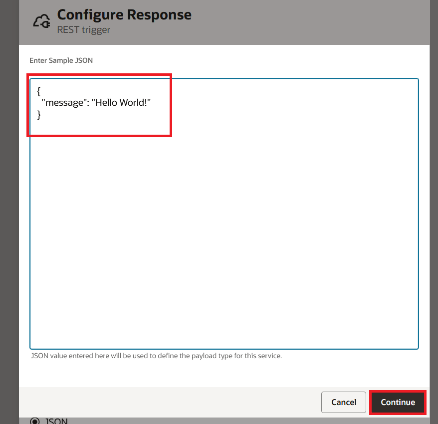 Enter the following sample JSON and click Continue: