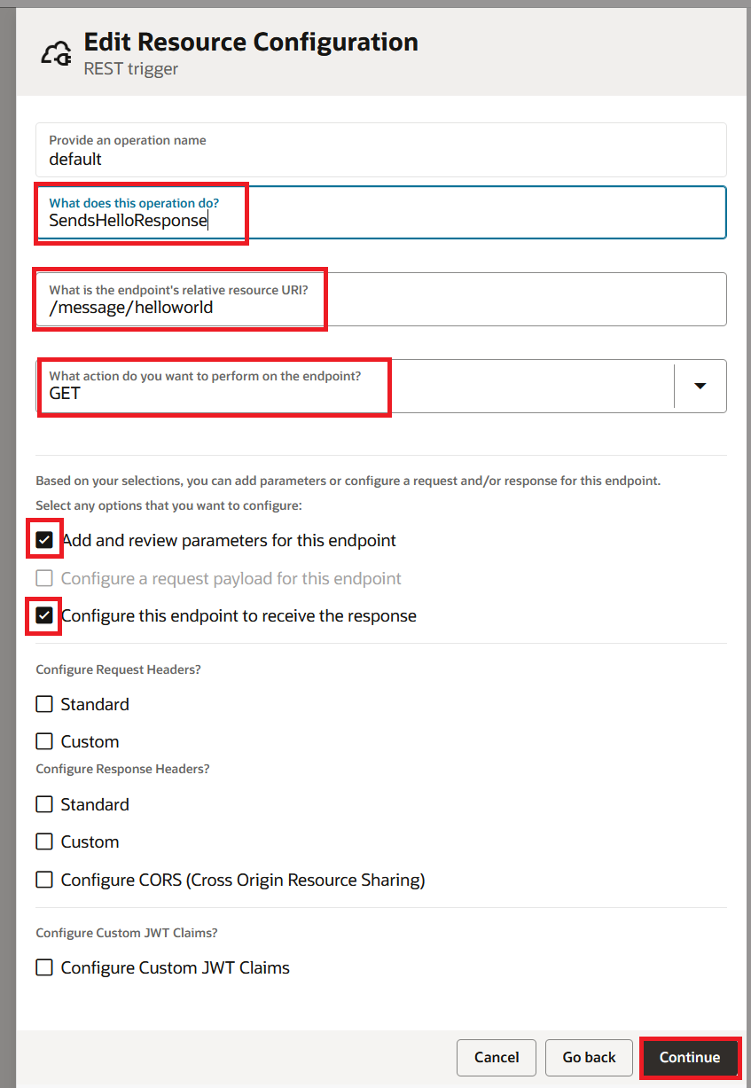 On the Edit Resource Configuration page, fill in the following details and click Continue: