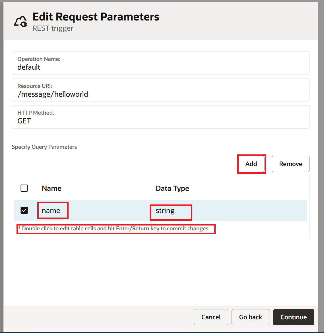 On the Edit Request Parameters page, click Add to add a query parameter. Set the Name as "name" and the Data Type as "string". Click Continue.