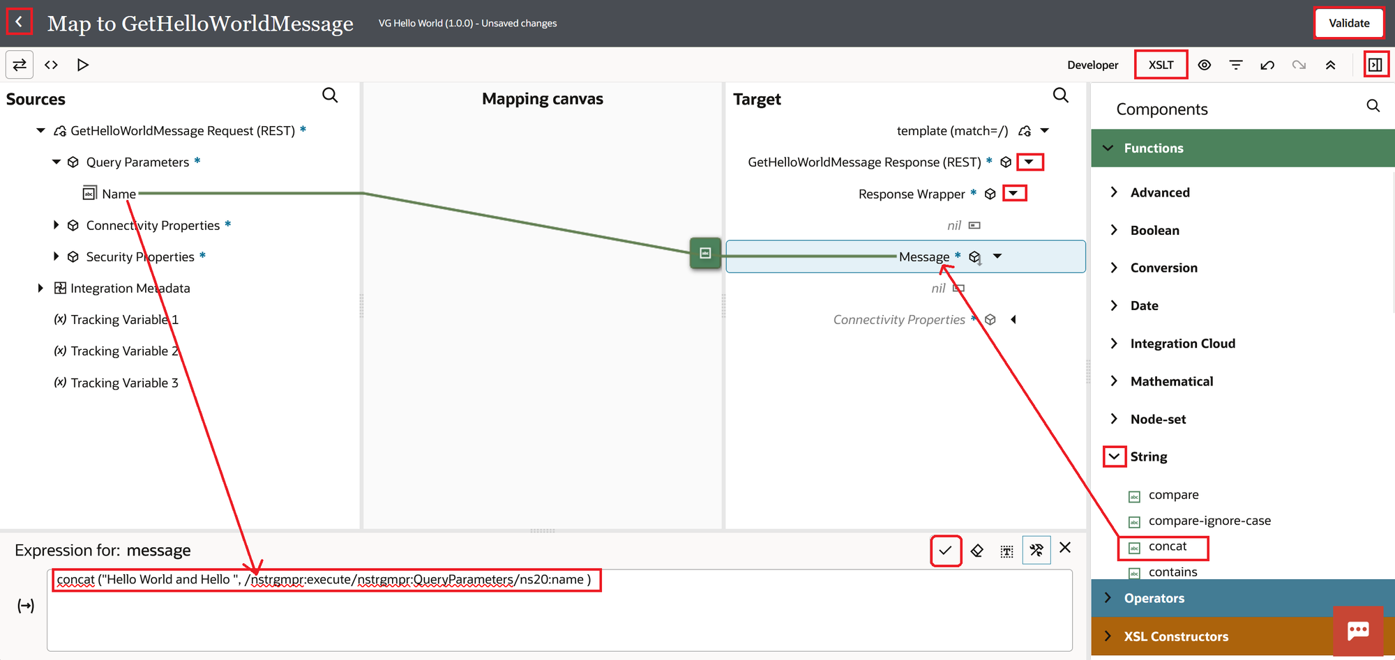 - Expand the "String" section under Components on the far right and drag the "concat" function onto the "Message" field.