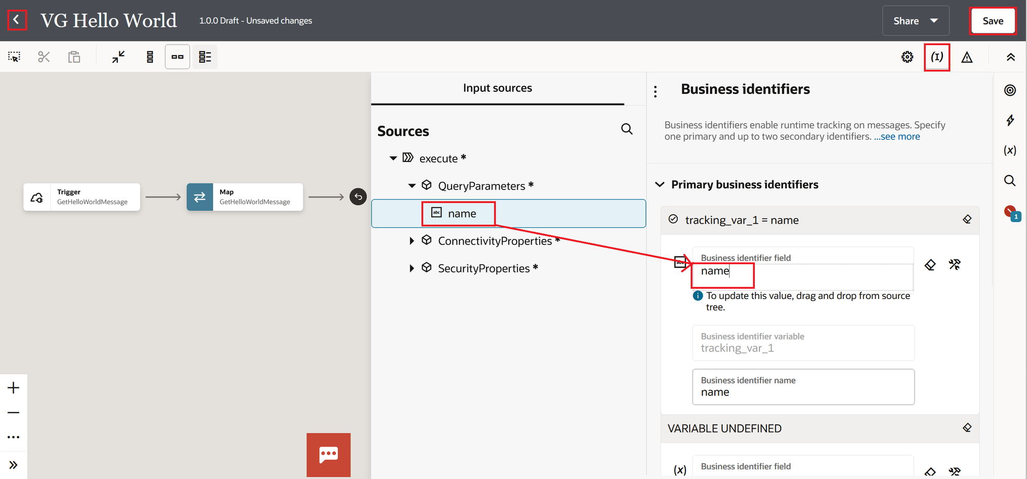 On the integration canvas, click the Business Identifiers icon (the one that looks like parentheses) on the top right toolbar. Drag the "name" field from the Sources panel and drop it onto the Business identifier field under Primary business identifiers. Click Save.
