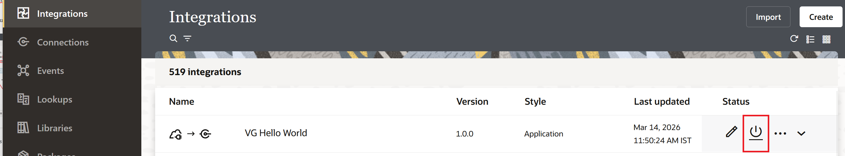 Navigate back to the Integrations list. Locate VG Hello World and click the Activate (power) icon.