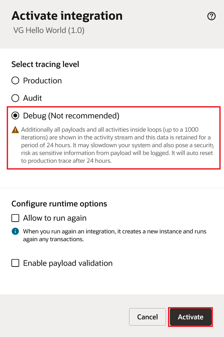 On the Activate integration dialog, select the tracing level as "Debug (Not recommended)" and click Activate.