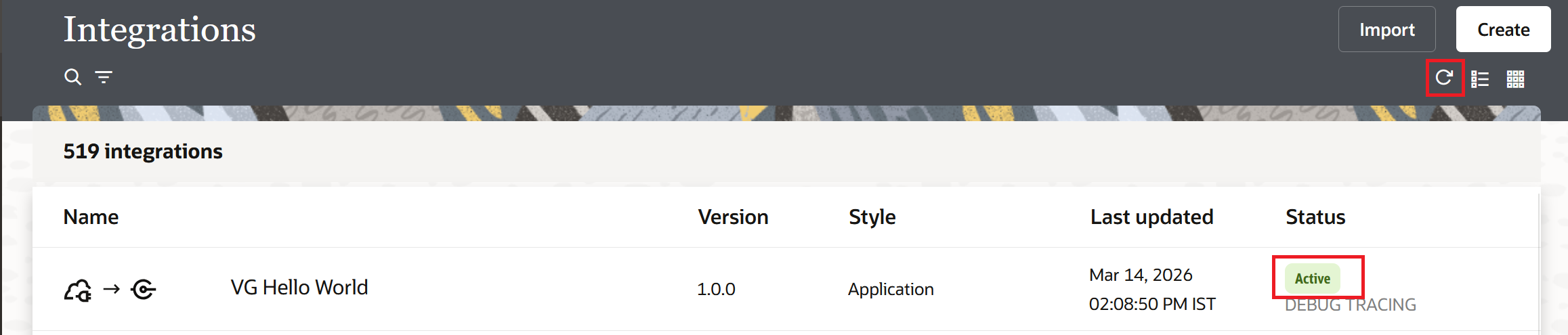 Refresh the Integrations page. The status of VG Hello World should now show "Active".