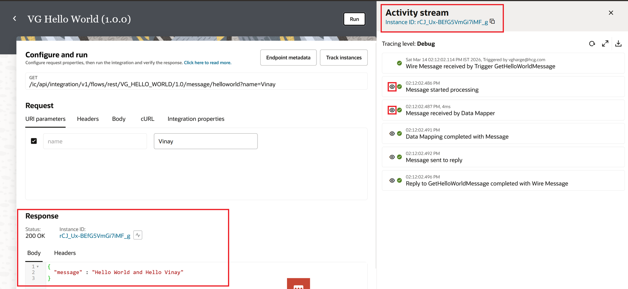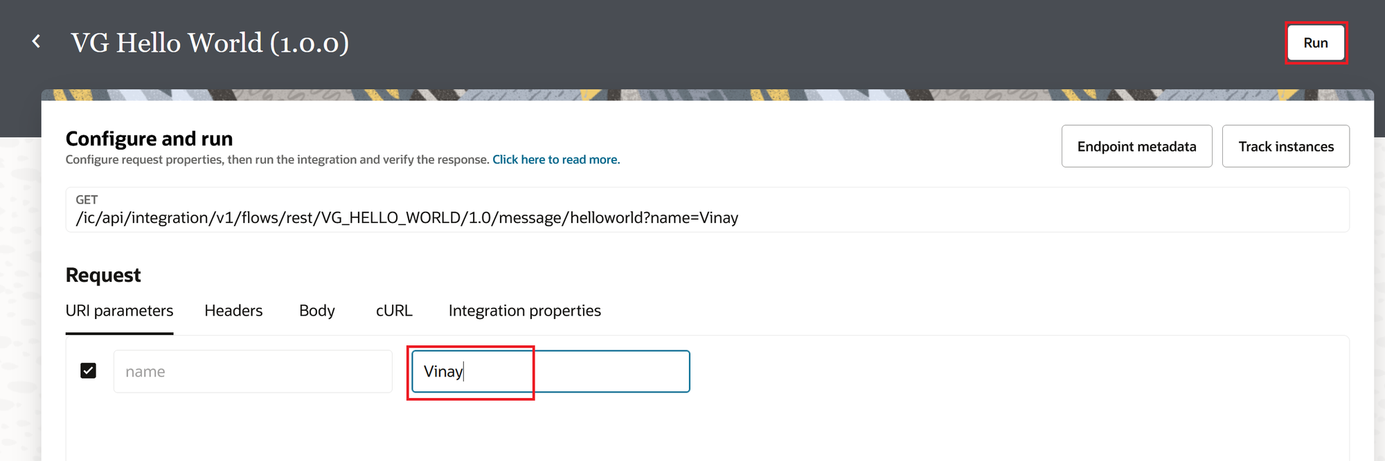 On the Configure and run page, enter "Vinay" as the value for the "name" URI parameter. Click the Run button.