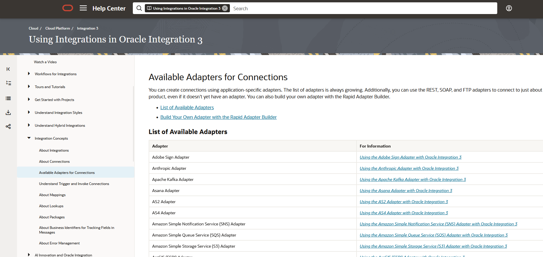 - Oracle Integration 3, Available Adapters for Connections, List of Available Adapters: https://docs.oracle.com/en/cloud/paas/application-integration/integrations-user/connection-creation.html