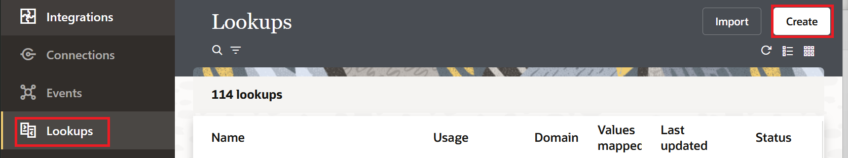 - Click Create. You can import the Lookup CSV file as well but the format of the CSV file is a bit tricky. The CSV format has the table name in the first row, column names in the second row, and data from the third row onwards. I recommend exporting an existing lookup first and using that as a template. The import will fail without a useful error message if the format is off. Also, while importing a CSV file, if a lookup with the same name exists, OIC will ask if you want to overwrite it. It will replace your entire lookup.