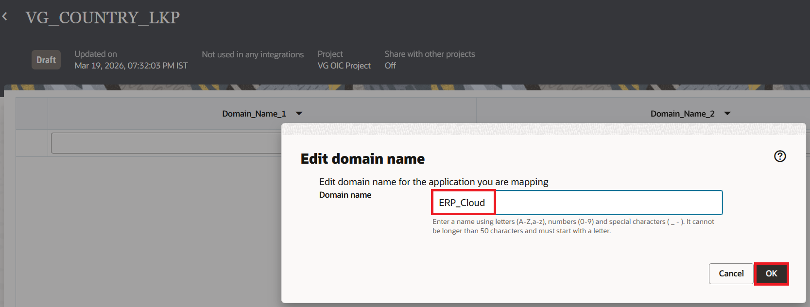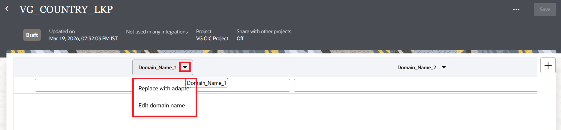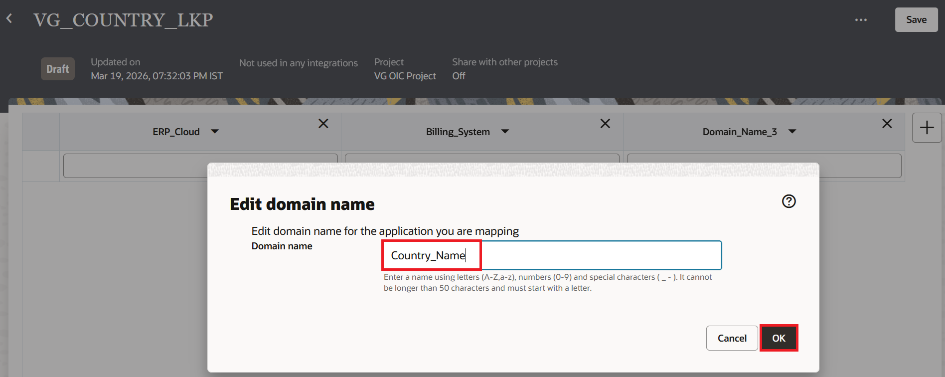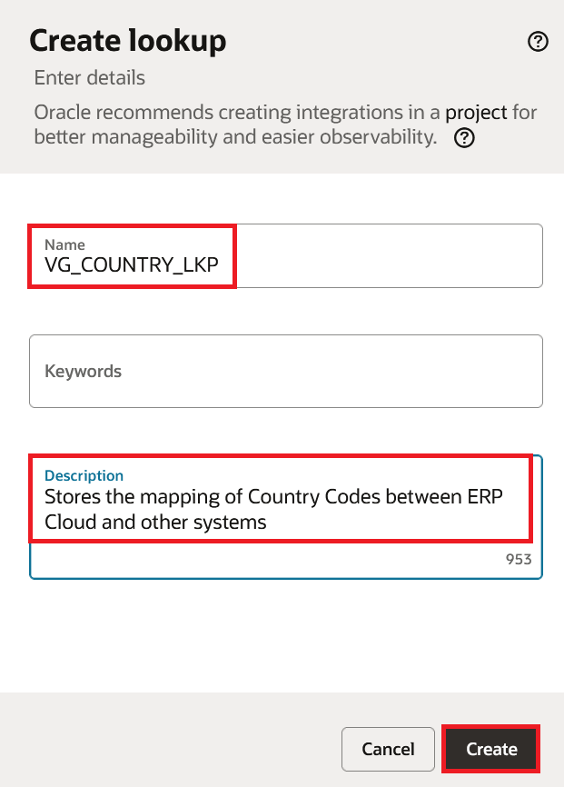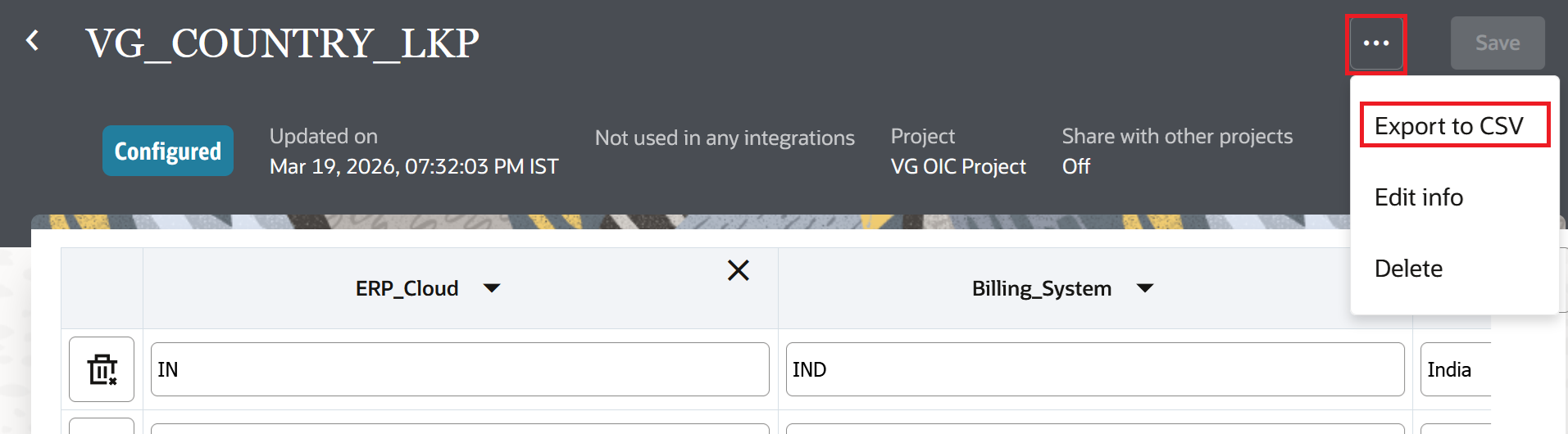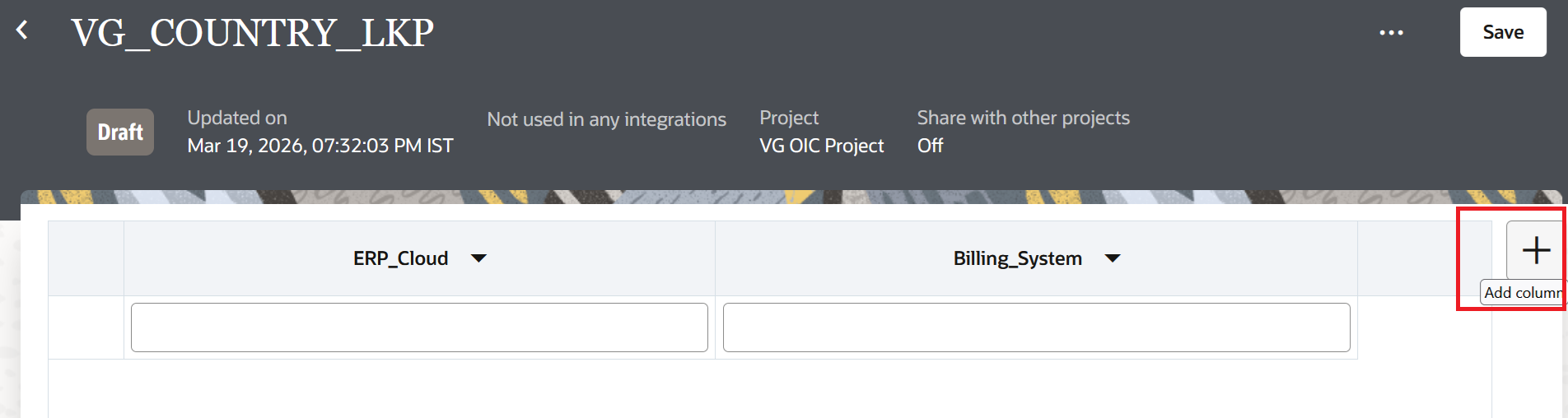 In this blog, we will take an example of storing the source and target values for country codes. Oracle ERP Cloud sends two-letter country codes like US, IN, FR but the target billing system expects three-letter codes like USA, IND, FRA. We will also add a third column for the full country name which can be useful for reports or notifications. Once the lookup is created, it will show two columns with default names. We can either rename them or replace them with the actual adapter.