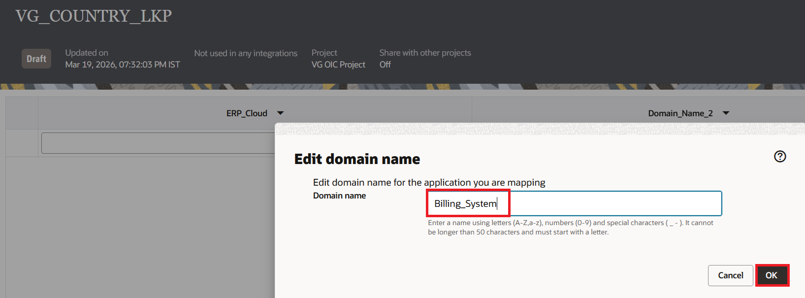 Now, when the integration runs and ERP Cloud sends US, the lookup returns USA. When it sends FR, the lookup returns FRA. If you need the full country name in a different integration or mapper, you can use the same lookup and choose Country_Name as the target column instead of Billing_System. You don't need to make a separate lookup for that.