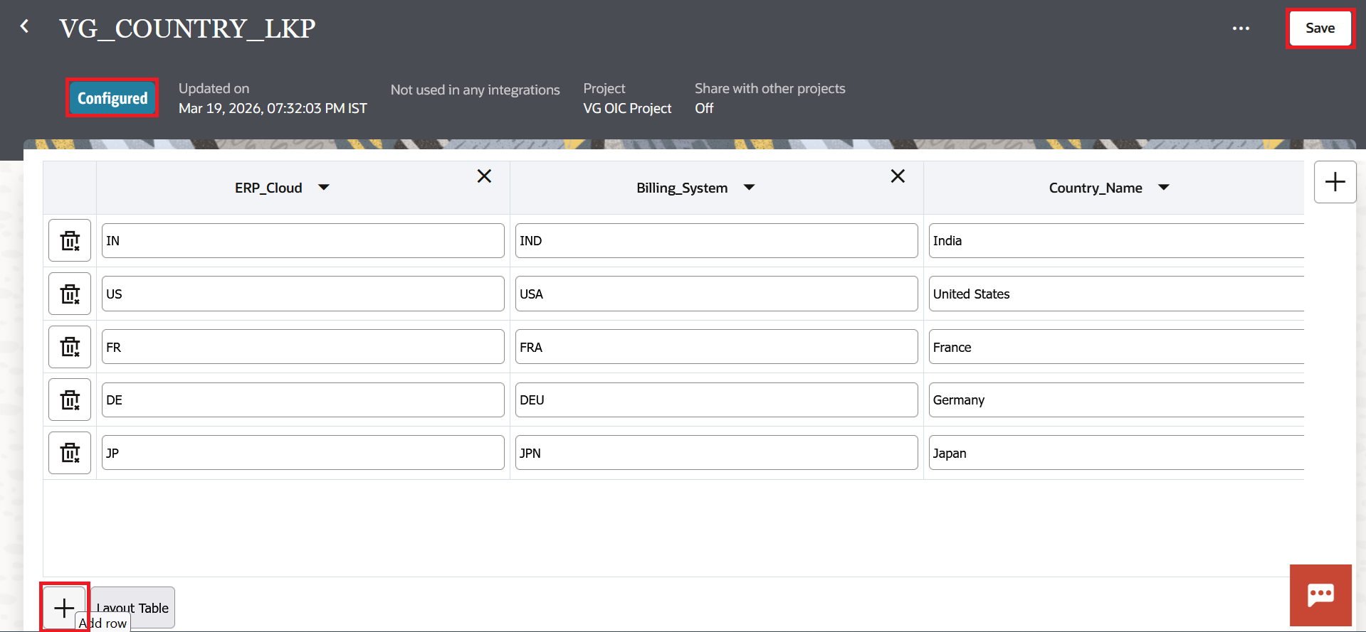 This is the best part. What if the business moves to a new country? Just go to the lookup, add a new row, and save it. It's that easy. The new value is picked up when the integration runs again. You didn't even have to touch the integration. No stopping. No reactivation.