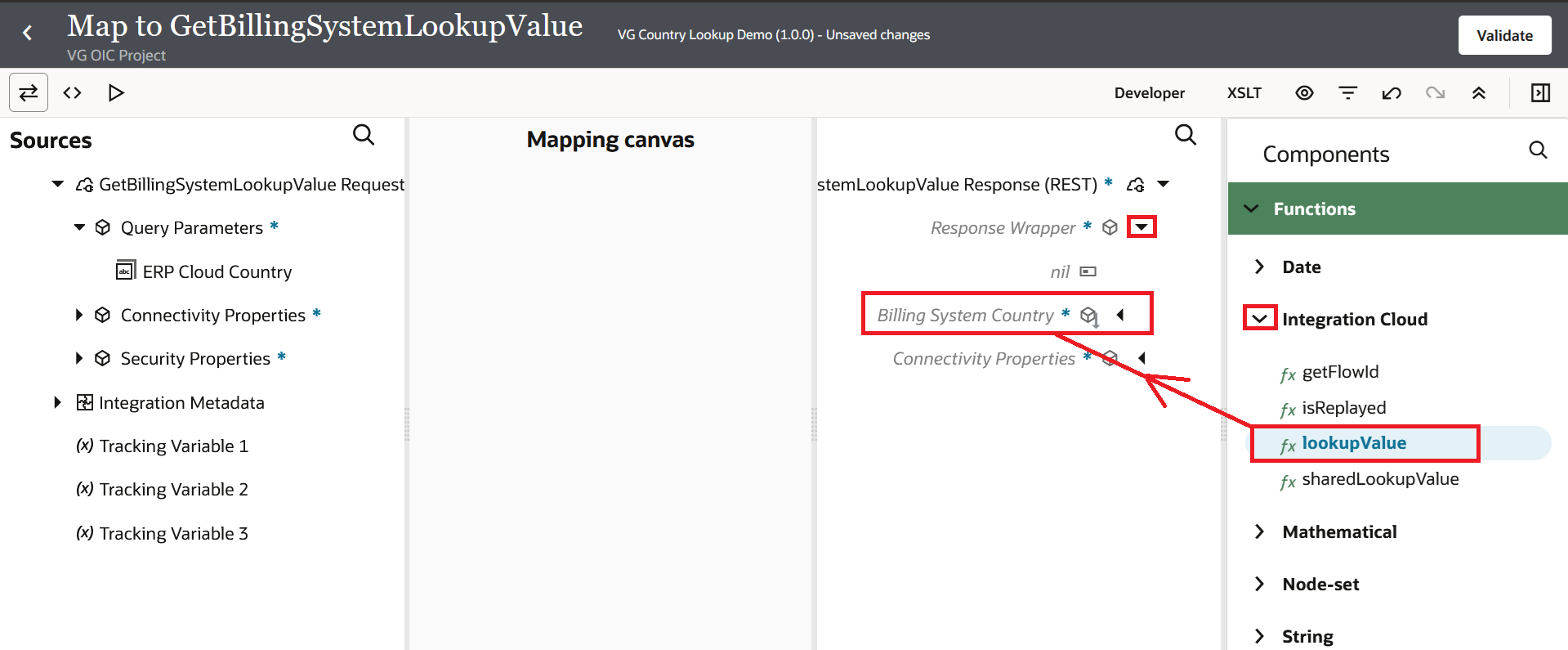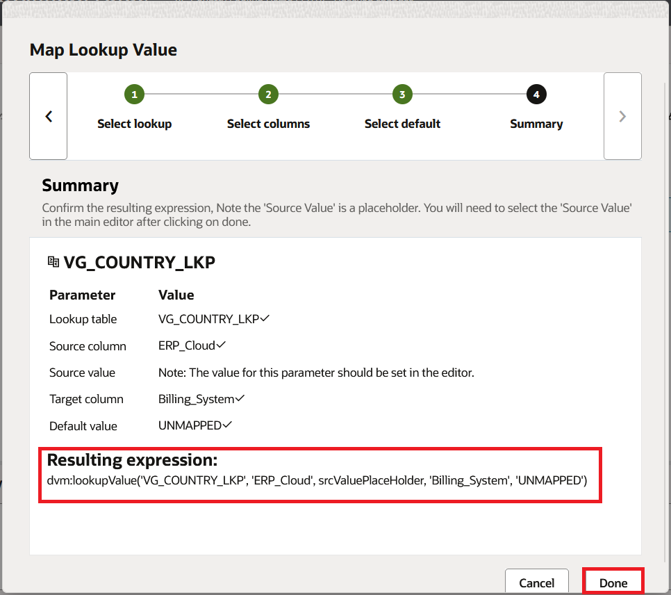 dvm:lookupValue('VG_COUNTRY_LKP', 'ERP_Cloud', srcValuePlaceHolder, 'Billing_System', 'UNMAPPED')