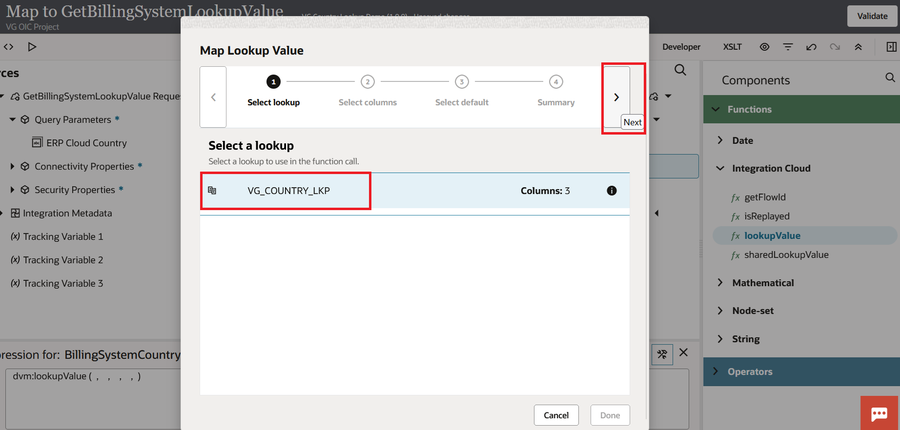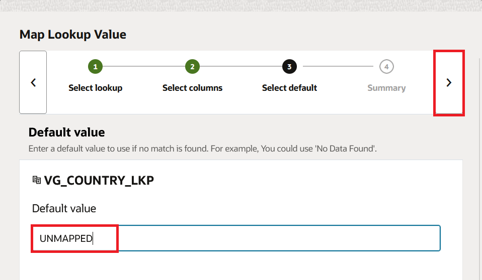 UNMAPPEDas the default. When the lookup is unable to locate the country code, this is what is returned. Instead of sending blank or meaningless data, I always set a meaningful default so that the downstream system knows something didn't match. Press the forward arrow.