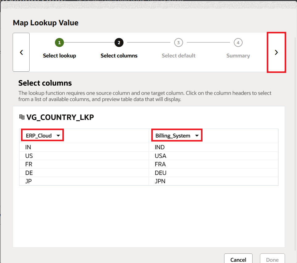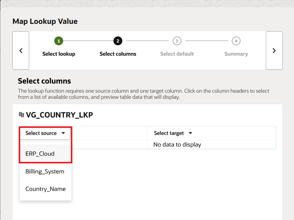 ERP_Cloudas the source column andBilling_Systemas the target. To ensure you are selecting the correct values, the wizard displays the values in each column. Press the forward arrow.